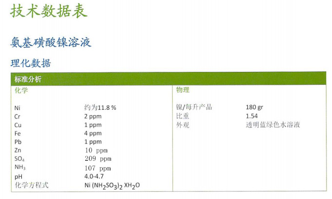 簡介:優美科氨基磺酸鎳每桶30公斤,鎳含量180克/升,用VALE-INCO純鎳粉生產,純度高,雜質低,市場高端品牌,色澤清亮,主要用于連接器、端子、電子產品、線路板電鍍鎳